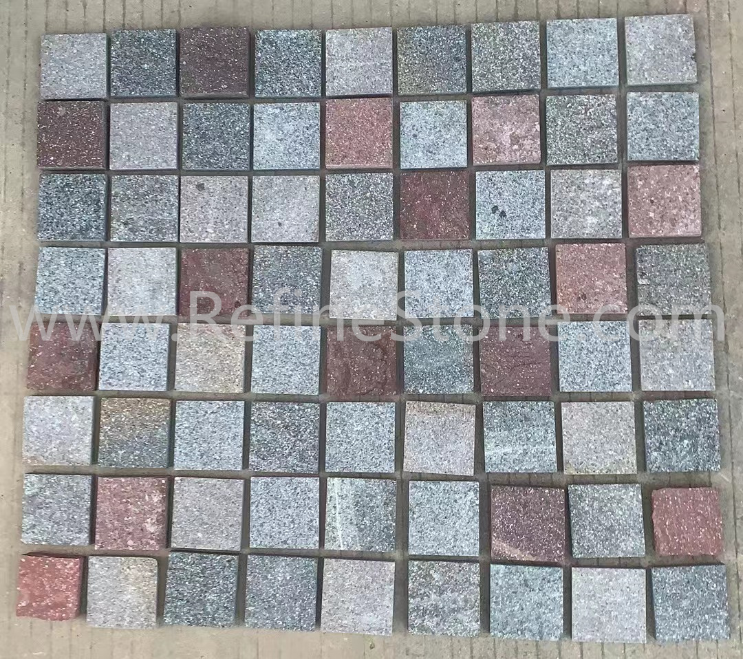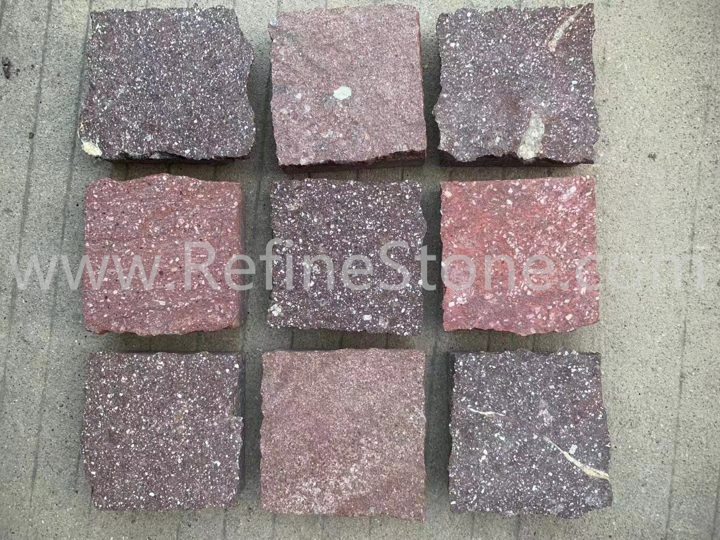 Porphyry, also commonly known as Cobblestone, makes it one of the strongest stones and most important materials both for paving and for cladding. It is not selected according to color, which vary greatly as a result of millions of years of moisture, oxides and concretions infiltration. The range of colors goes from grey to red and violet with several different shades. Porphyry stands wear and tear very well. It is resistant to all components of the atmosphere, such as ice and intense cold. Because of its chemical and physical features it is suitable for pedestrian areas and other areas subject to very heavy traffic. Porphyry's anti-slip quality, even in wet and icy conditions, allow for the paving of the streets, courtyards, gardens, parks and the creation of street furniture items. Porphyry comes in a variety of forms such as: <1>Cobbles, <2> Kerbstone, <3>Natural Cleft Tiles, <4>Machined Surface Tiles,etc.